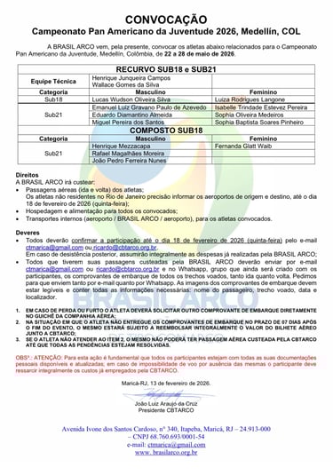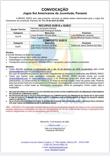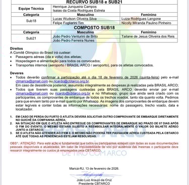 As vagas foram conquistadas em janeiro de 2026, nas seletivas que aconteceram no CT da BRASIL ARCO em Maricá/RJ, onde a atleta Luiza Langone superou o índice estipulado para a categoria Sub-18, finalizando em primeiro lugar.